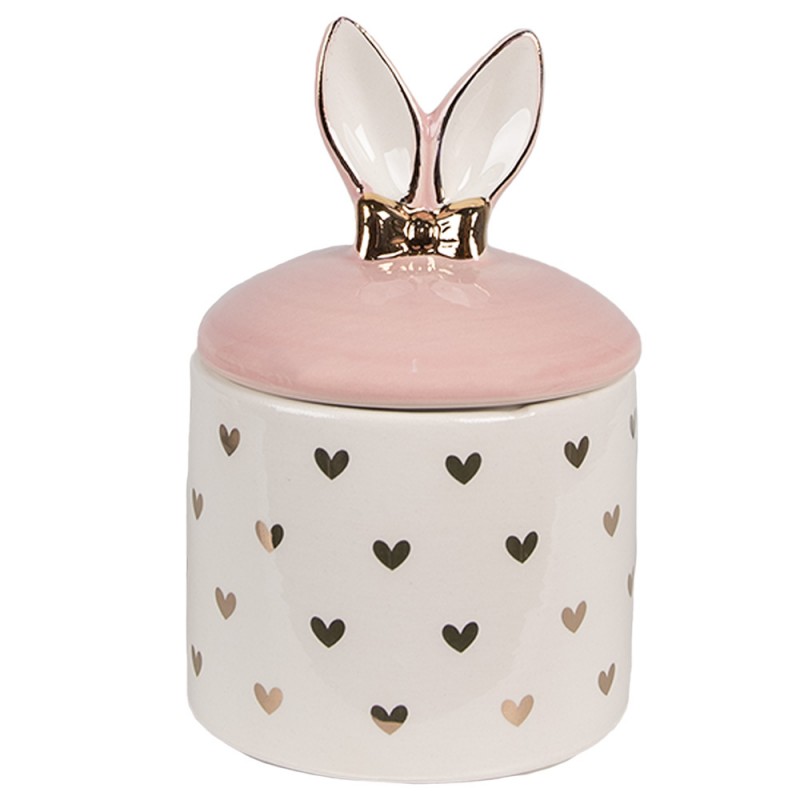 Un grazioso barattolo portaoggetti dai colori pastello, decorato con cuori e orecchie di coniglietto sul coperchio, offre stoccaggio pratico ed esteticamente gradevole per piccoli oggetti. Un bel regalo o un’aggiunta elegante alla decorazione pasquale